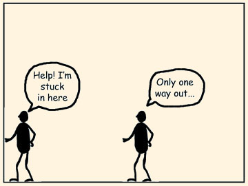 The 12-letter word foreshadowed indicates a figure. The following word (fury) has value 10, so the figure is located at X=10; the last letter of fury, Y, is odd, so the figure faces left. Taking every 7th letter of the succeeding text gives the contents of the speech bubble ("Only one way out"):