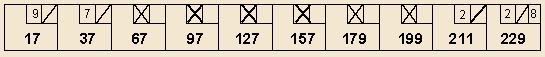 (Another interesting way to do it is to change the first two frames to 7- X, which causes the game to have 7 strikes in a row - the maximum possible in an all-prime game.) The proof that this is the maximum possible score seems to be not simple; our best proof uses computer assistance and so is not easily proffered in words. The success of the above game is dependent on a nice long string of small primes in arithmetic progression with difference 30 (7, 37, 67, 97, 127, 157).