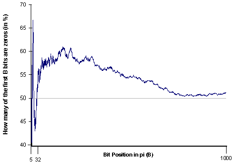 Figure 3. Zeros vs. ones in binary pi.The vertical axis shows the percentage of zeros in the first B bits. After some initial wild swings, ending with a value of 50% at bit 32, the graph suddenly zooms up to a phenomenal peak of 61% at bit 164 and stays well above 50% for several hundred bits. It is still noticeably above 50% at bit 1000, and does not hit a value of exactly 50% again until bit number 6356 (about the number of bits in the Lady Pi picture). Since the 0 bits are the ones we color, there really are more large blobs of color in the picture than one would expect by chance. Add to that a dash of human imagination, and the end result is Lady Pi.